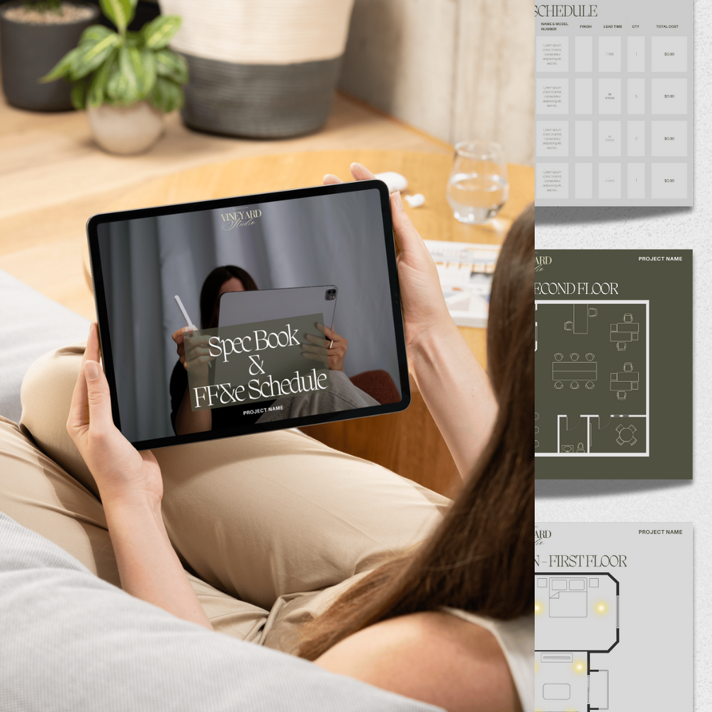 You'll Get: A fully customizable, professionally designed FF&E Specification Schedule Template. | Pre-written copy to set expectations, promote transparency, and excite clients about the design process. | Visually stunning layouts that align with your branding, ready for digital or printed use.